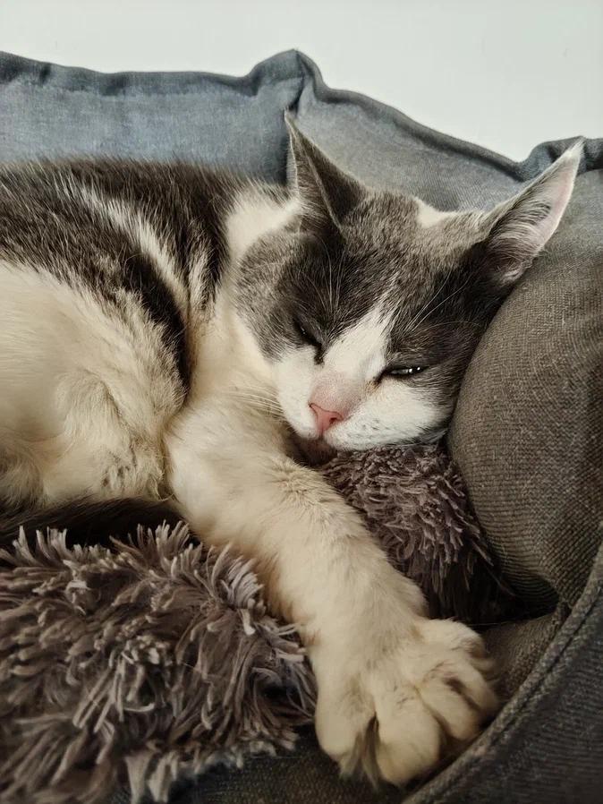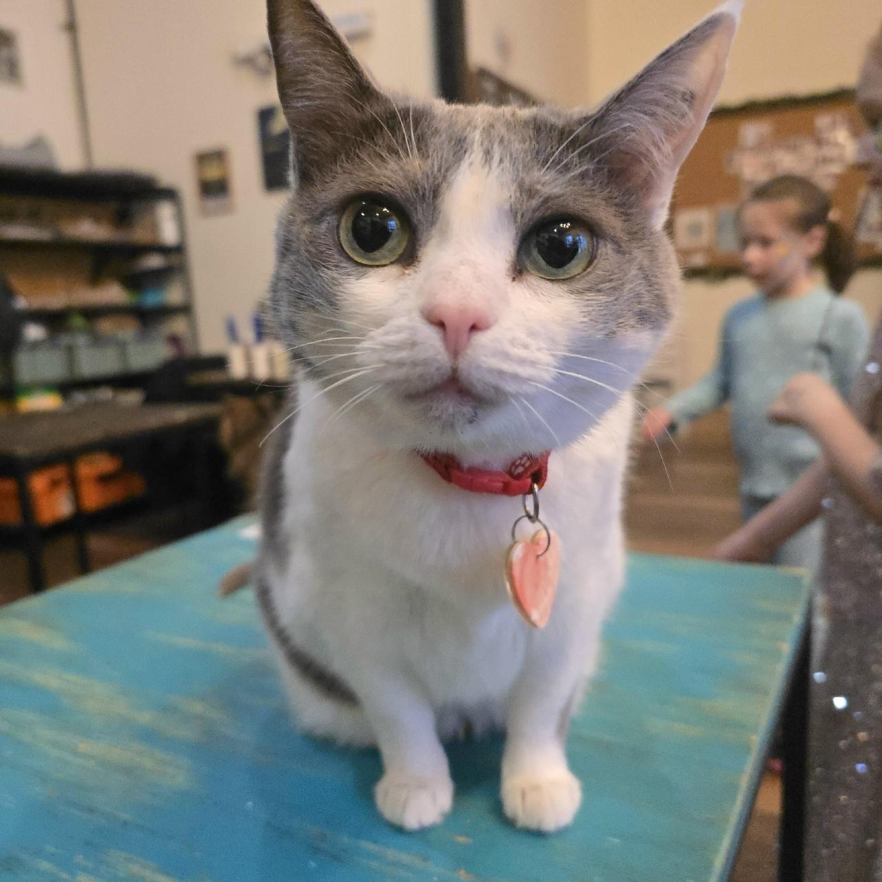 Марла — серо-белая кошка с выразительными глазами, аккуратной головой и округлым телом, которое так и хочется обнять.
