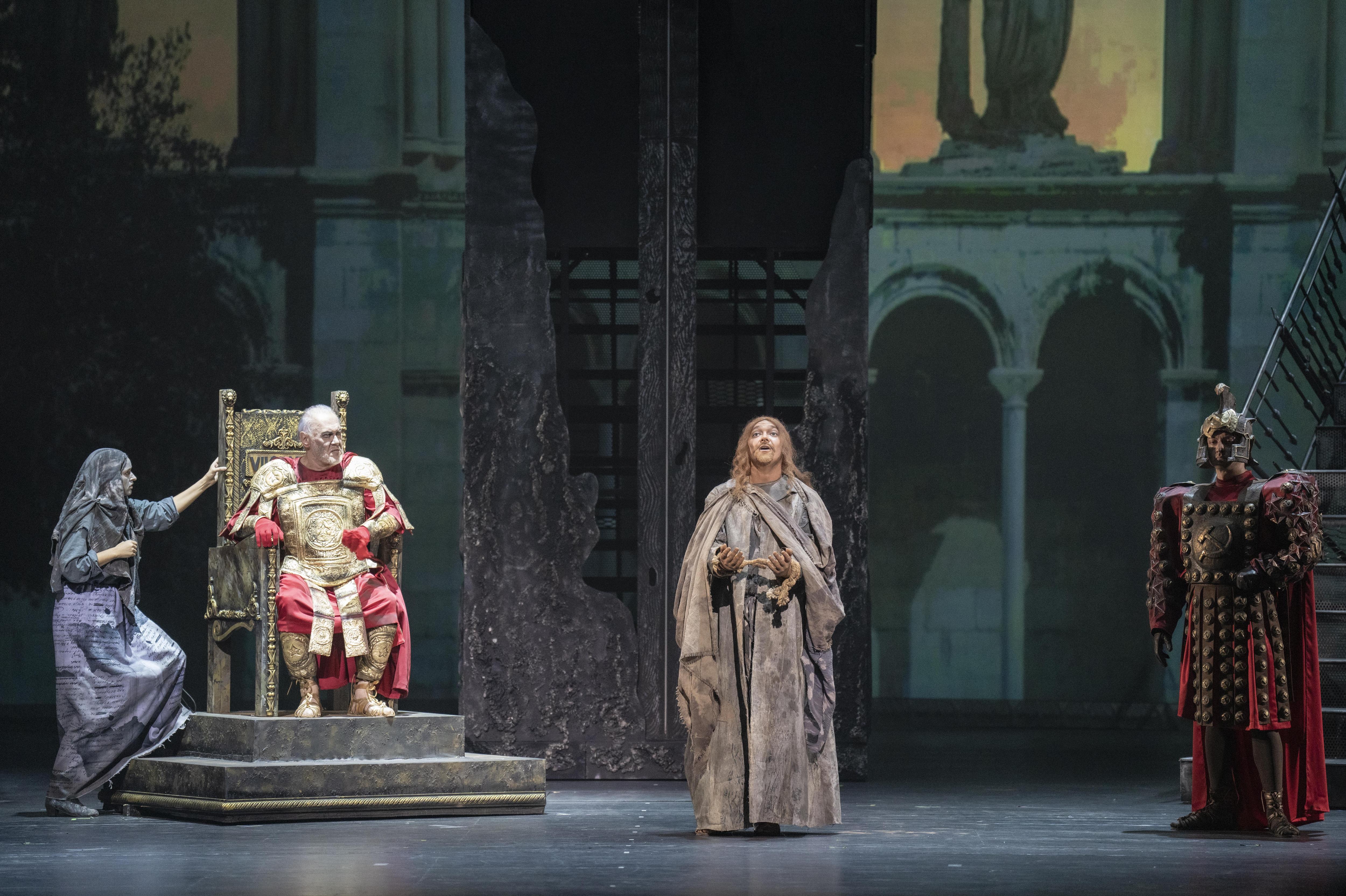 Поскольку библейский сюжет в романе является вымыслом Мастера, это обыграно с помощью сценических приёмов. В начале оперы дворец Пилата находится за прозрачным занавесом, который символизирует границу между реальностью и воображением. Эта граница неоднократно нарушается по ходу действия.