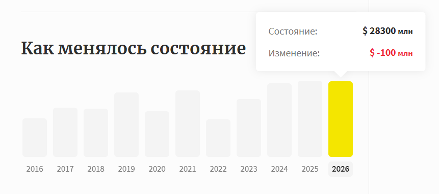 По данным издания, состояние бизнесмена сократилось на 100 млн долларов и теперь составляет 28,3 млрд долларов. Это первое снижение за последние несколько лет: с 2023 года капитал Михельсона только рос.
