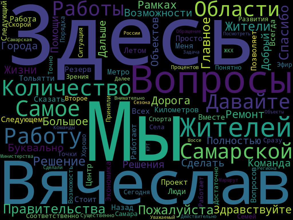 Чаще всего звучали слова «Мы» (273 раза), «здесь» (106 раз) и «Вячеслав» (45 раз). В графическом представлении они выделены наиболее крупным шрифтом.