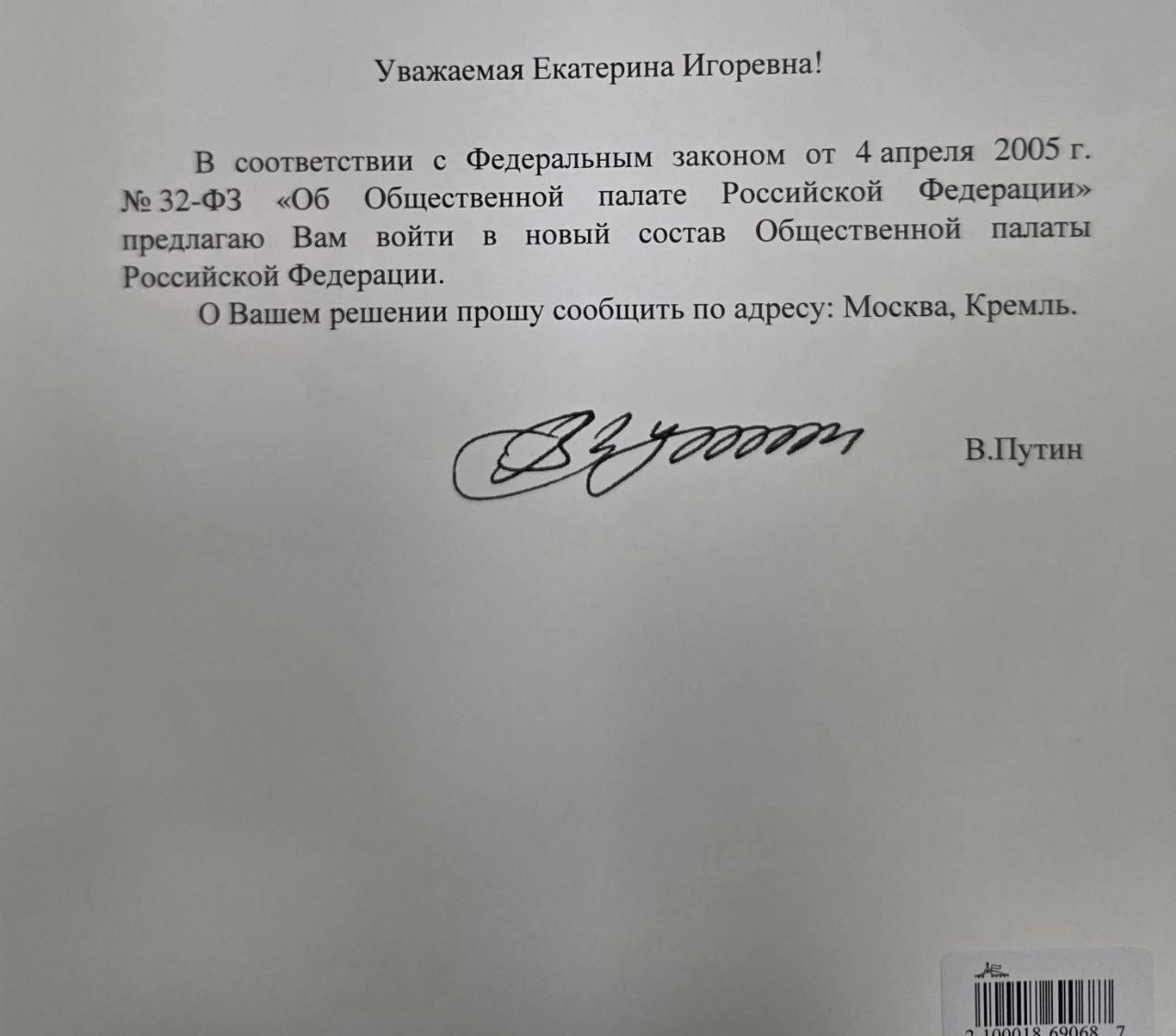 «Приглашение войти в новый состав Общественной палаты Российской Федерации. Лично от Президента», — так прокомментировала Колотовкина получение документа.